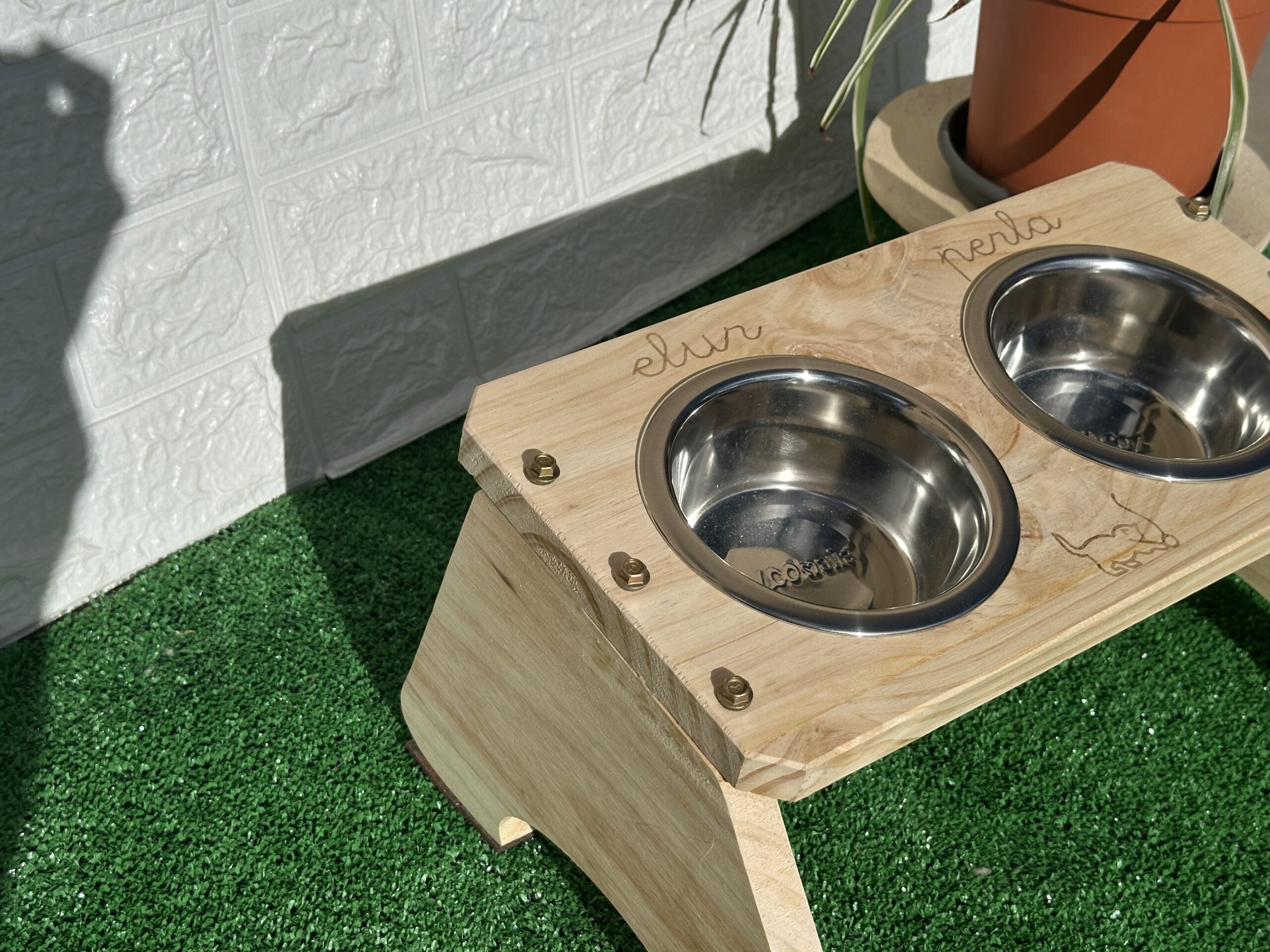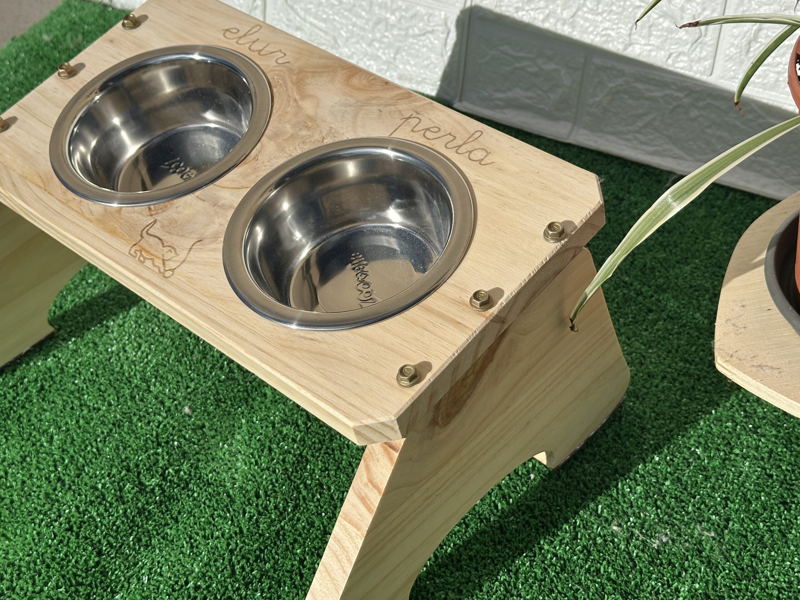 Fabricado de forma artesanal con madera sostenible, este comedero para perros y gatos combina diseño, funcionalidad y respeto por el medio ambiente 🌿. Su estructura sólida y elegante aporta un toque natural a cualquier hogar, mientras que su acabado cuidado garantiza seguridad y durabilidad en el uso diario. Además, cada pieza incluye personalización con grabado láser, permitiéndote añadir el nombre de tu mascota o un mensaje especial, convirtiendo el comedero en un accesorio único y lleno de personalidad.